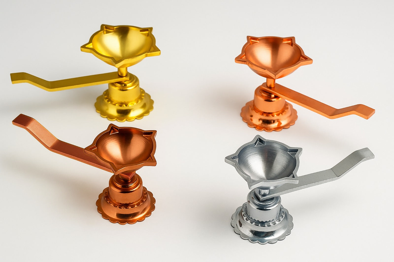 Most of the items, especially traditional pooja products, are handcrafted with detailed attention. Some electronic items like the aarti machines are precision-manufactured.