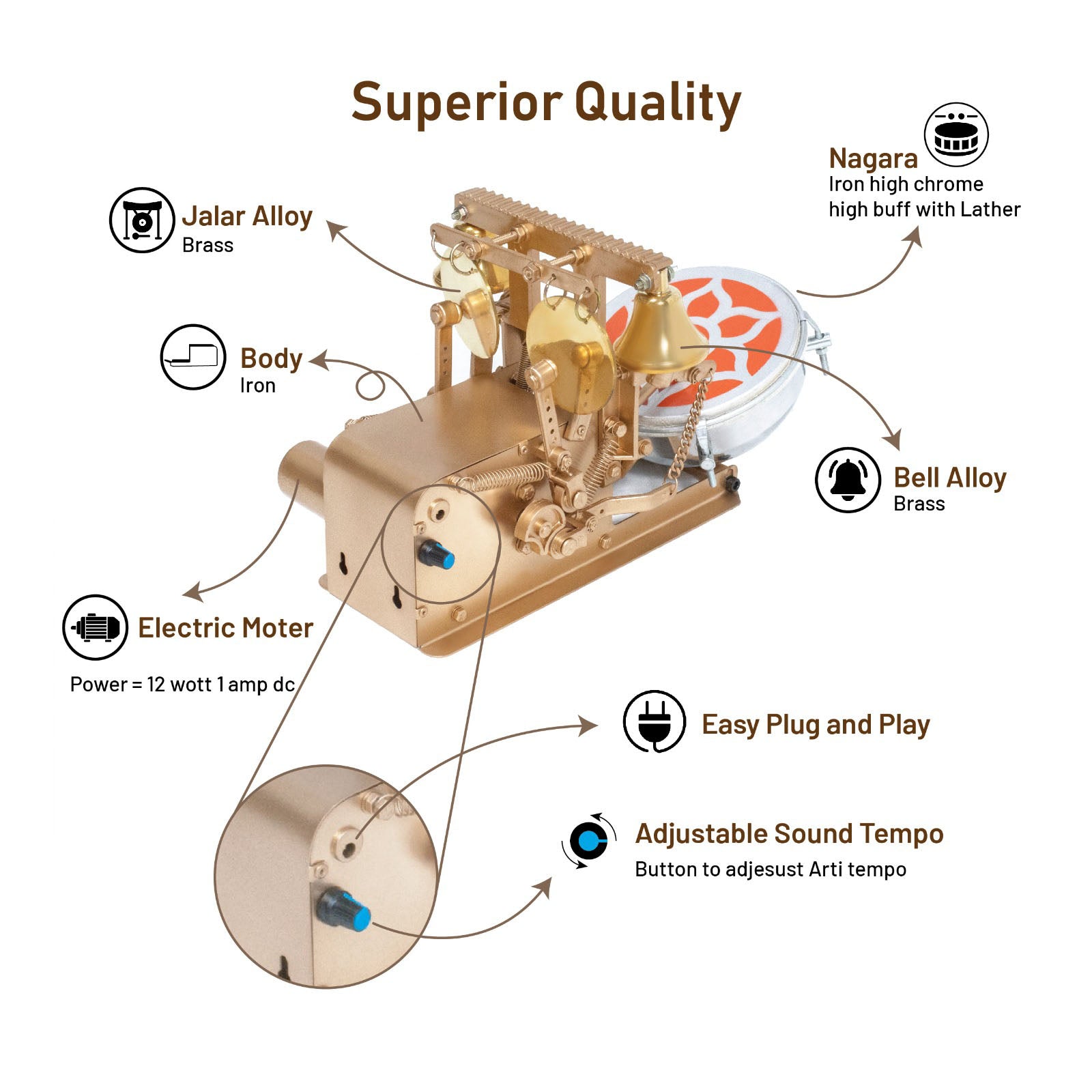 We are using good quality materials to make the bells and jalar. Aslo using good quality leather to mount the nagada as well as good and well known companies electric motors.